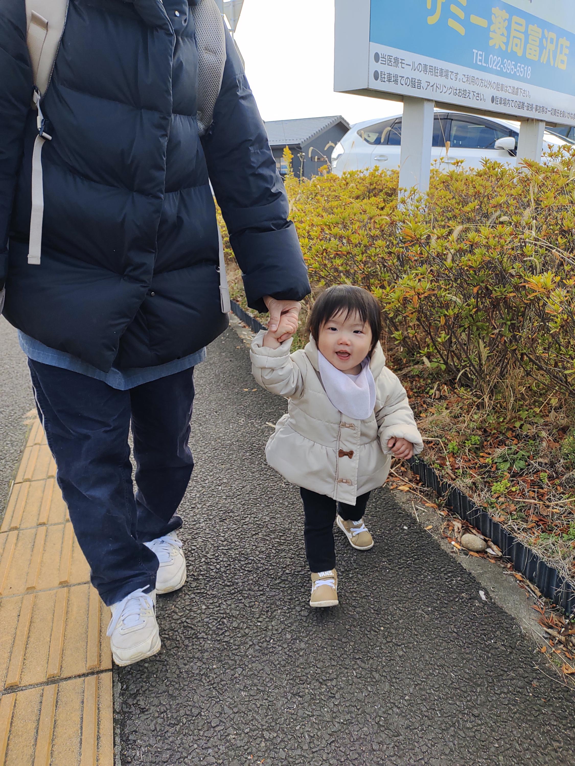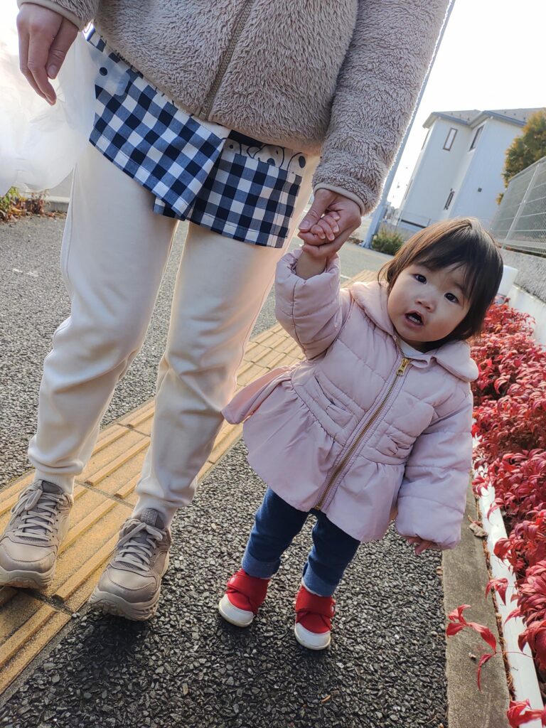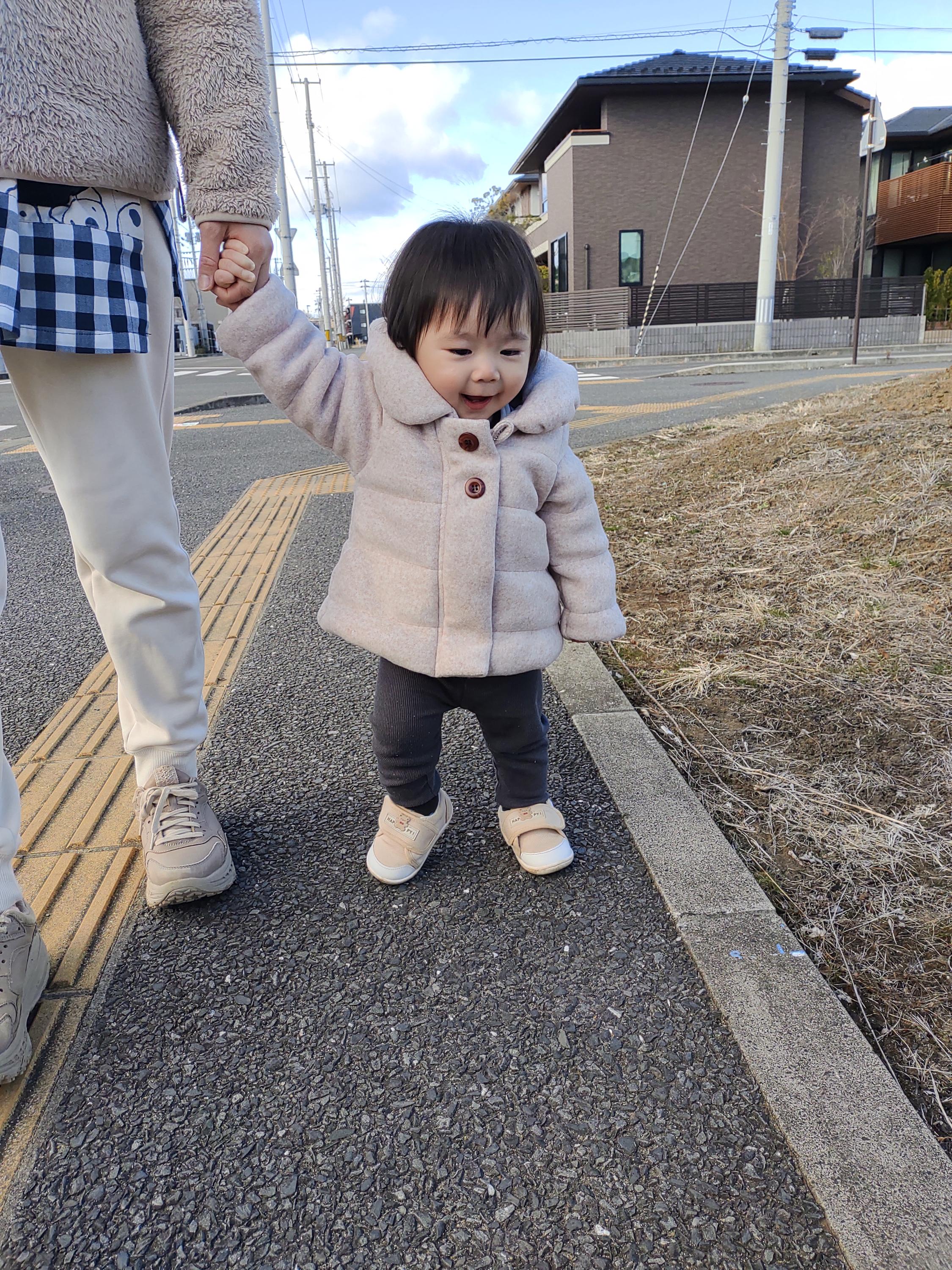 最初は苦手だった靴にも慣れ、上手に手をつないで歩いています👟