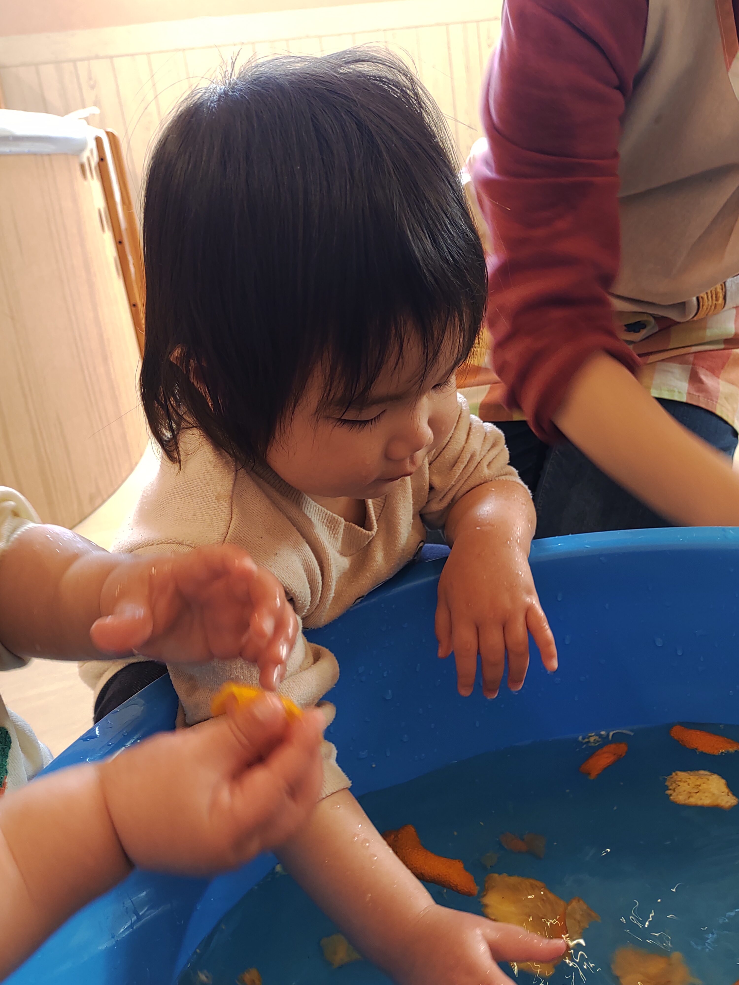 初めての活動でしたが、興味津々な様子でお湯の中に手を入れて手浴を楽しむ子どもたち。
