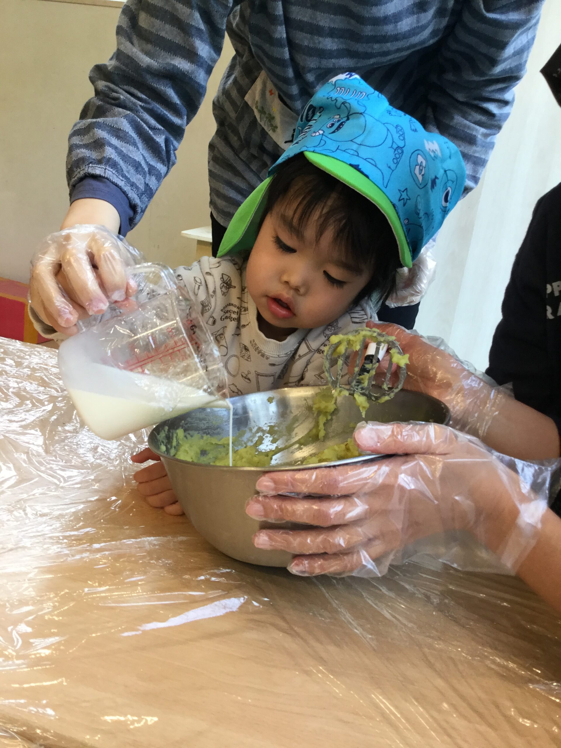 全部材料を入れ終わると、「たべてみてもいい?」とタネを手に取りパクッ。お友達と顔を見合わせ、「おいしいね」と味見をする姿がとっても可愛らしかったです♡